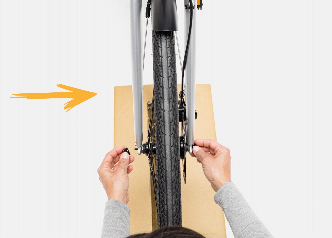3. Standing alongside the bike, put one foot against the bike box tray to help keep the box (and bike fork) stationary as you turn the handlebars.